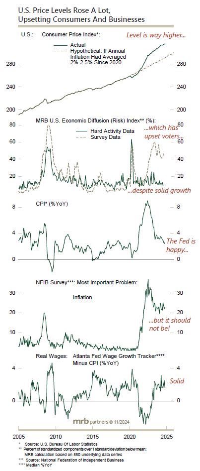 There has also been a massive disagreement in the U.S. (and DM in general) regarding the issue of “inflation”. American voters are still angry with the huge increase in price levels this decade, which has far overshot pre-pandemic trends. Conversely, the Fed (and Treasury-bulls) believe that inflation has now been tamed, a view that we do not share. Rather, we expect sticky and above-target inflation to persist, as was reinforced with last week’s CPI report.