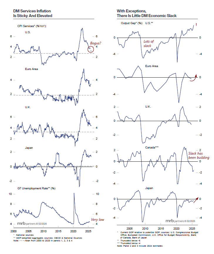 However, inflation has stalled above the average levels recorded in the prior two decades, especially domestically-generated inflation (proxied by service sector CPI). Crucially, there is little economic slack outside the weakest (and smaller) DM countries, and no slack in the still-robust U.S. economy.
